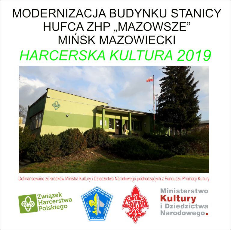 Udało się, 12 lipca 2019r. podpisaliśmy umowę z Ministerstwem Kultury i Dziedzictwa Narodowego na realizacje zadania “Modernizacja budynku Stanicy Hufca ZHP “Mazowsze” Mińsk Mazowiecki – Harcerska Kultura 2019”. Jest to drugie dofinansowanie celowe, które pozwala na dalszą modernizację .